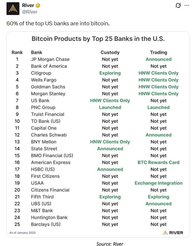 According to data shared by Bitcoin financial services firm River, 60% of the top 25 U.S. banks have either already launched or publicly announced plans to support Bitcoin products, including trading, custody, and crypto-backed lending.
