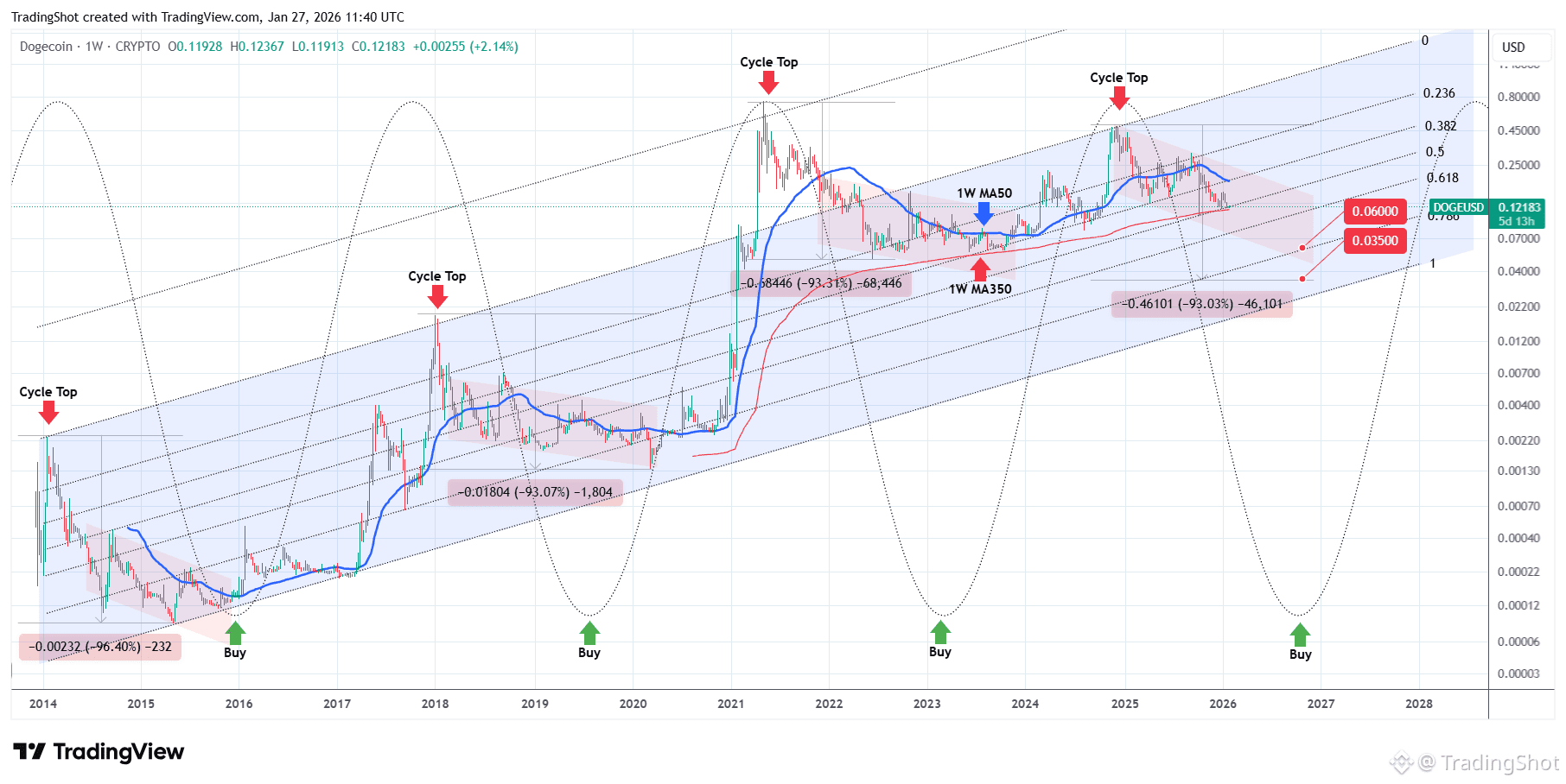 The 1W MA350 in particular is of the utmost importance as it held as Support during both previous Bear Cycles. As a result, if it breaks now, there are high probabilities to initiate Phase 2 of the Bear Cycle. This either bottoms on the 0.786 Fibonacci retracement level of Doge's historic Fib Channel Up at around $0.0600 or extend to a full -93.00% decline (as much as the previous two corrected by) around $0.03500.