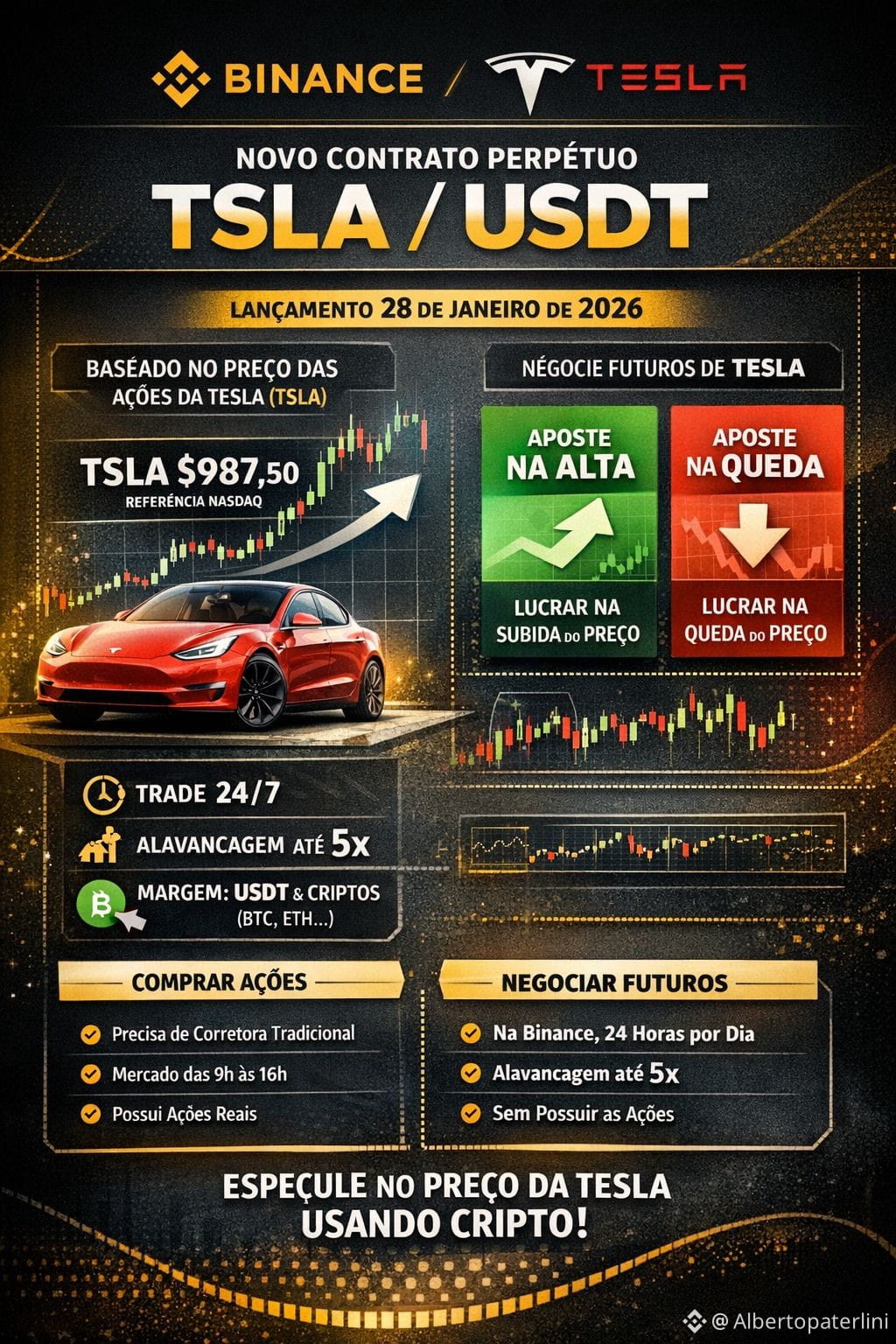 💡 Diferente de um “token meme” ou uma criptomoeda própria chamada “Tesla”, este produto é um contrato vinculado ao preço real das ações da Tesla Inc. — similar a um derivativo de ações, mas acessível via Binance. �