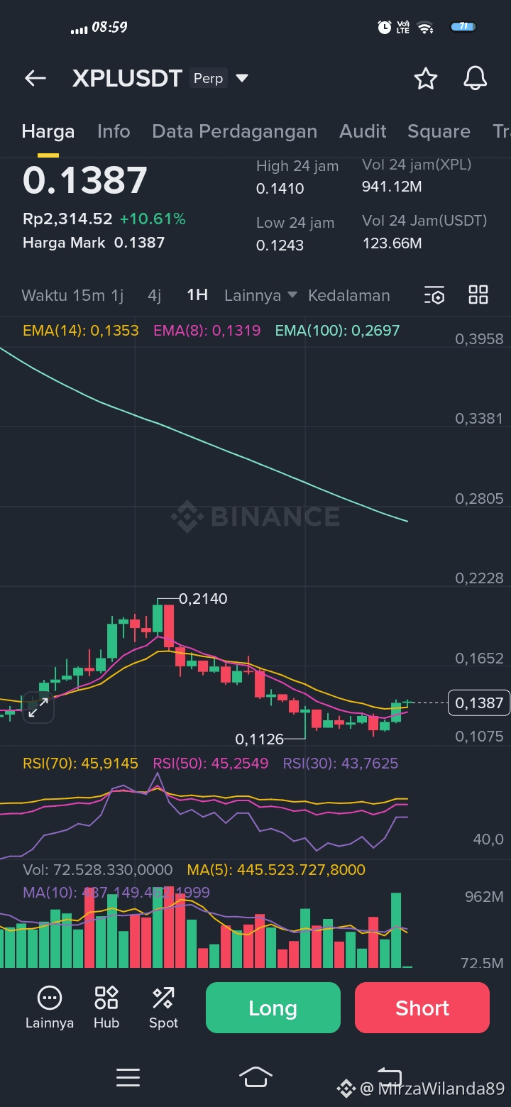 Dari sisi EMA, harga sudah mulai bertahan di atas EMA cepat (8 & 14), menandakan momentum jangka pendek mulai berpihak ke buyer. RSI harian juga perlahan naik dari area netral, belum overbought, sehingga masih ada ruang lanjutan jika volume tetap sustain.