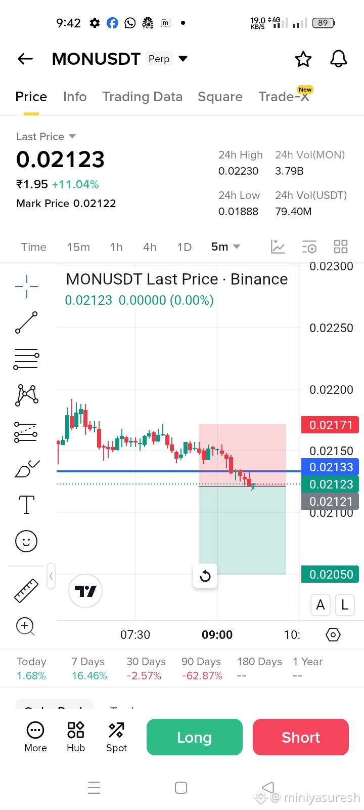 MONUSDT short-term chart shows bearish momentum. Price has broken key support near 0.02133 and is trading below it, indicating selling pressure. Lower highs and continuous red candles suggest sellers are in control.