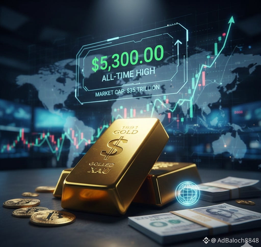 In a historic move that has sent shockwaves through both traditional and decentralized finance circles, Gold ($XAU) has officially breached the psychological $5,300 per ounce mark. This monumental rally has pushed the total market capitalization of the world’s oldest store of value above a staggering $35 trillion, solidifying its reign as the ultimate safe-haven asset.