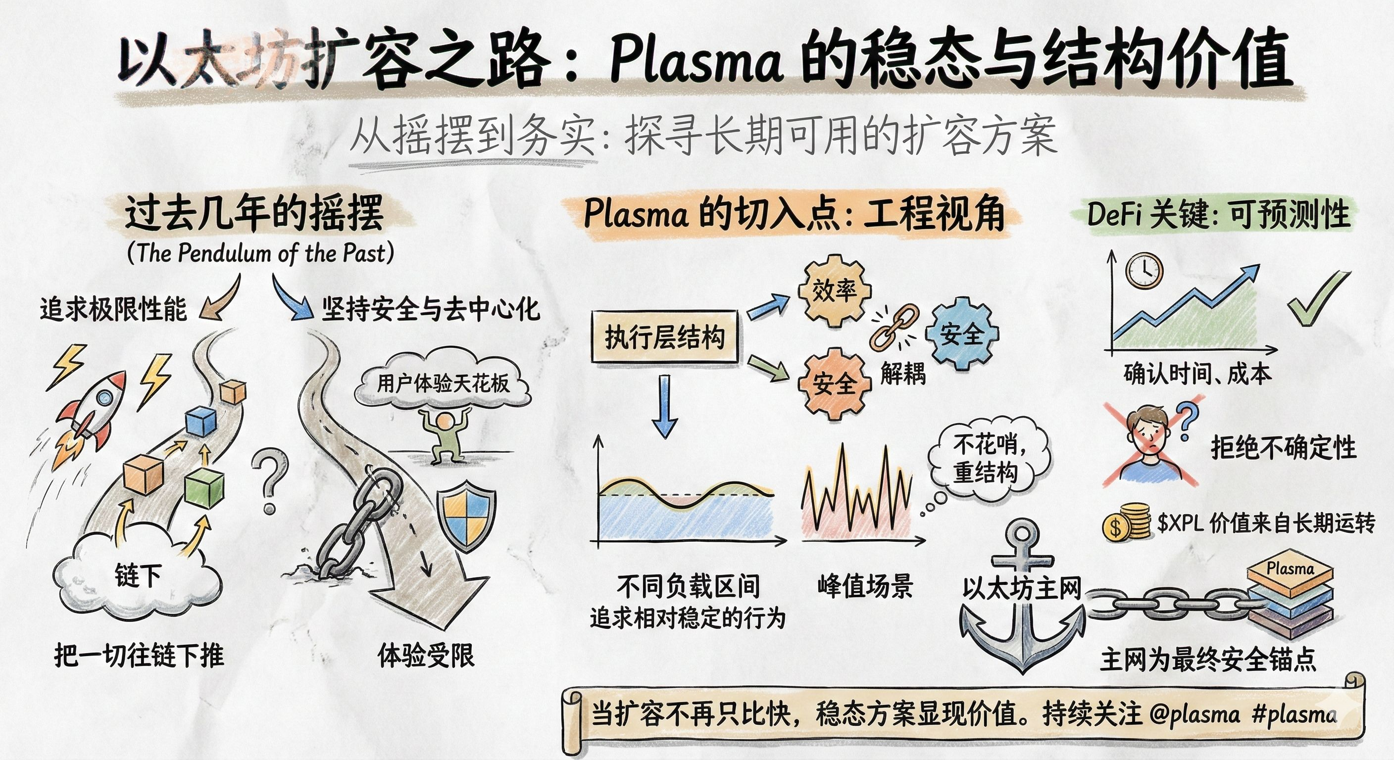 web3领域发展的是越来越快,如果把过去几年以太坊扩容的路线摊开来看,其实一直在两个方向里来回:一边是追求极限性能,把一切都往链下推;另一边是坚持安全与去中心化,但用户体验始终被天花板压着。@Plasma 给我的第一印象,并不是速度有多夸张,而是它在认真回答一个更现实的问题:什么样的扩容方案,真的能被长期使用。