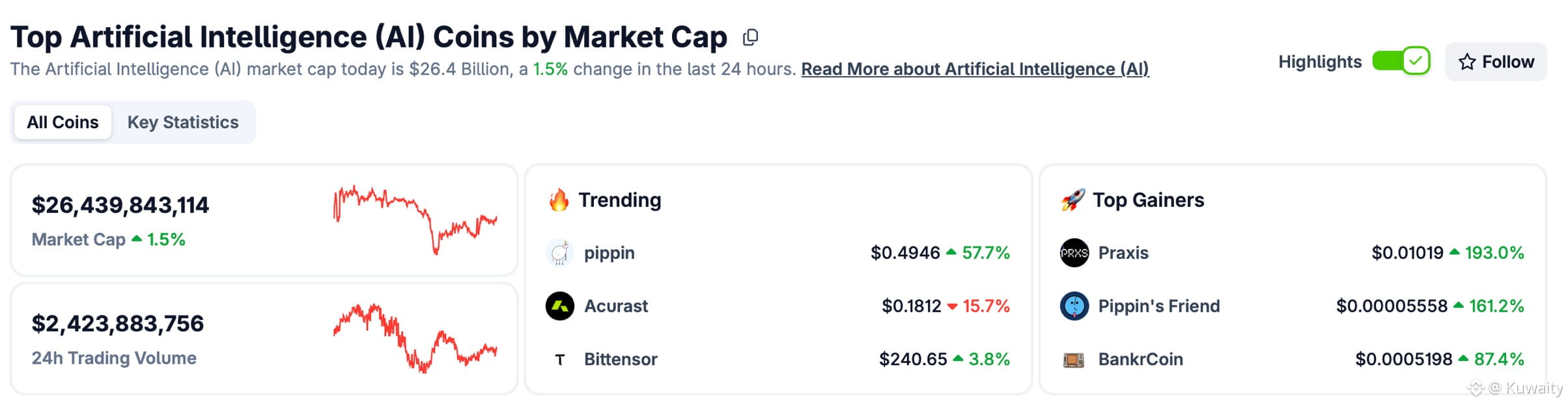 تسجل الرموز التي تمزج بين تقنيات الذكاء الاصطناعي والبلوكشين مكاسب انتقائية، مما يدفع القيمة السوقية للقطاع فوق 26 مليار دولار.