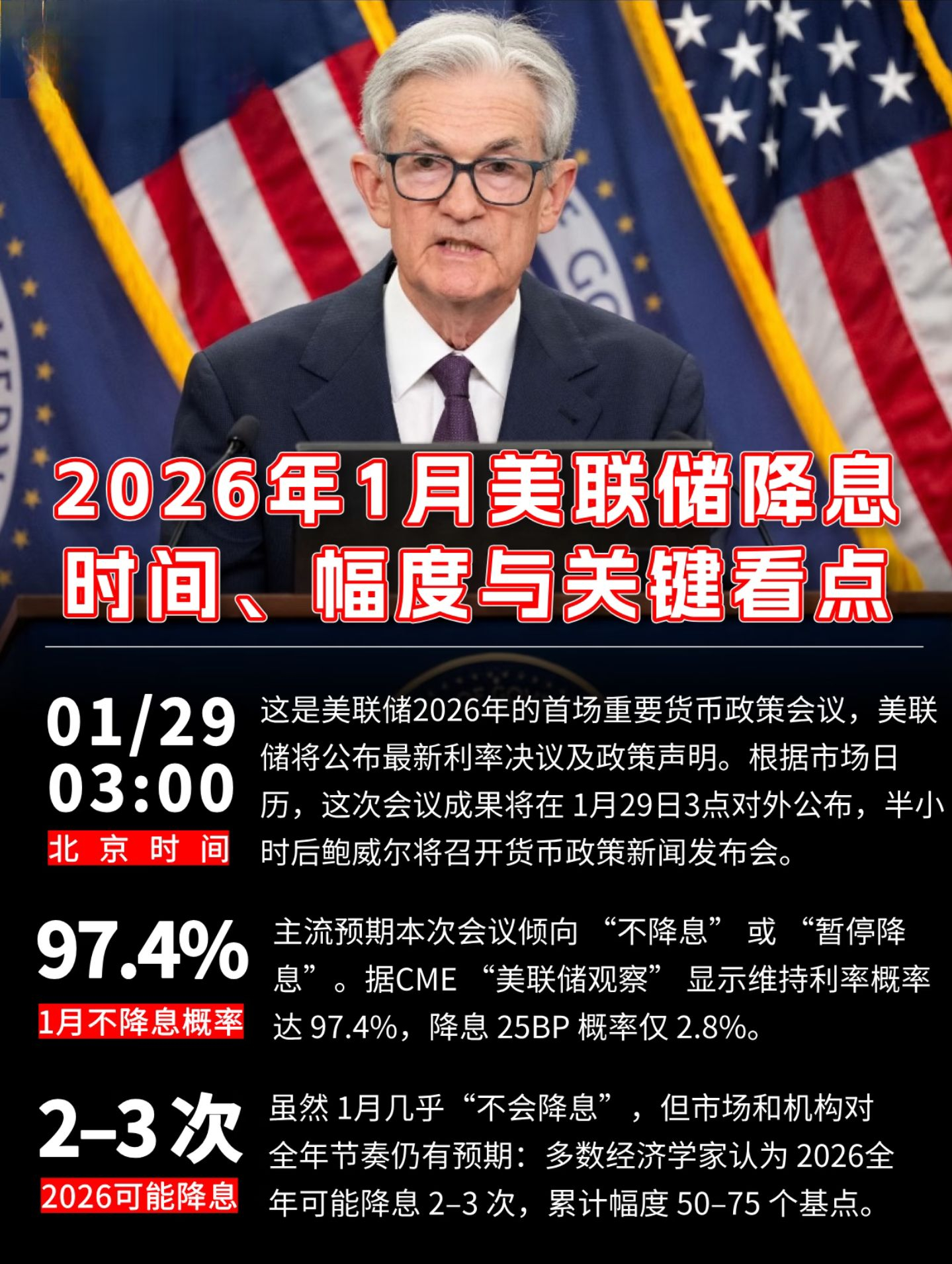 关键信号:美联储进入"观望期",后续降息节奏取决于就业和通胀数据。市场目前预期2026年仍可能降息2-3次,但时点可能延后。