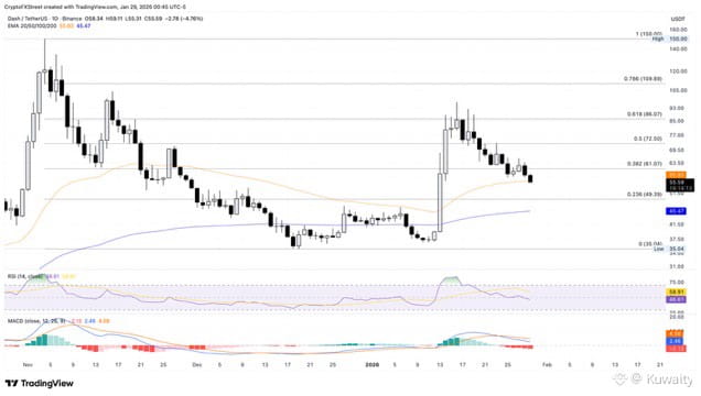 داش يواصل الانخفاض دون المتوسط المتحرك الأسي لمدة 50 يومًا، مما يعرضه للانخفاض إلى 50 دولار.