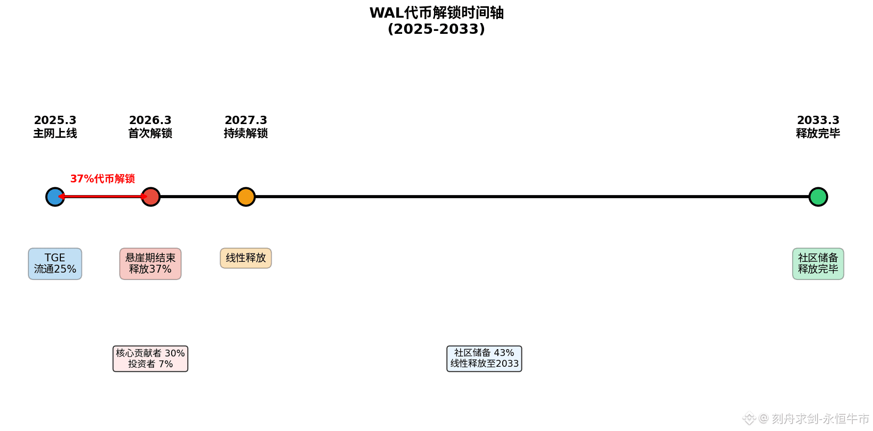 但技术好不代表能赚钱,这是两个概念。我开始看WAL的代币经济。当前价格$0.117,流通市值$2.3亿,流通量大概12.5亿枚,总供应量50亿。这意味着什么?意味着现在市场上流通的只占25%,还有75%的代币等着解锁。我翻了下解锁时间表,2026年3月,也就是主网上线一周年的时候,核心贡献者那30%和投资者那7%要同时开始解锁。那可是37%的总供应量,按现在市值算,潜在的抛压接近1.5亿美元。要知道现在整个流通盘才2.3亿,这股卖压如果一次性砸下来,价格得崩成什么样?