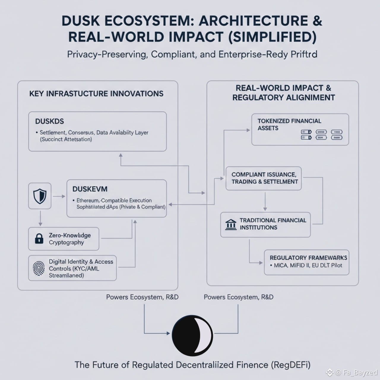 Key infrastructure innovations such as DuskDS the settlement, consensus and data availability layer and DuskEVM the Ethereum-compatible execution environment provide developers and enterprises with the tools needed to build sophisticated applications that are both private and compliant. Through zero-knowledge cryptography and protocols like “Succinct Attestation”, Dusk delivers fast finality and robust security while keeping transaction details confidential. This cryptographic foundation extends to digital identity and access controls that streamline compliance checks, simplify KYC/AML workflows, and maintain user privacy without sacrificing transparency where it matters.