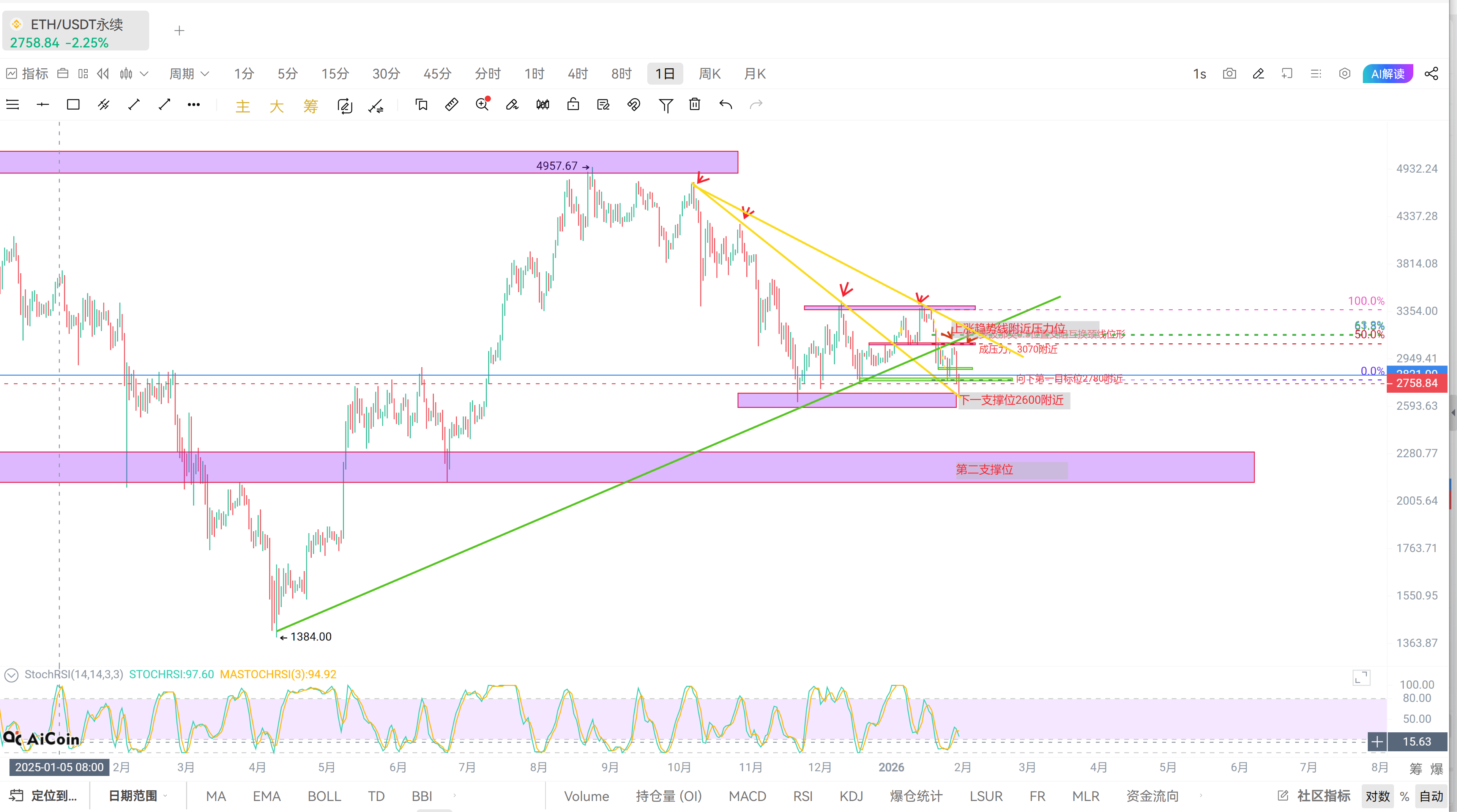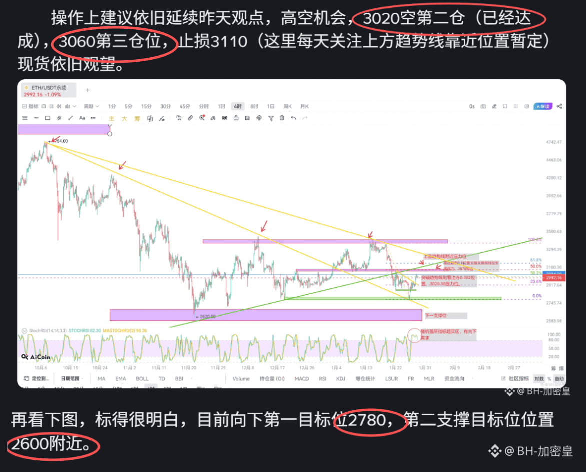 再来看下以太坊,我们也是一直提示向下第一目标位2780附近,第二目标位为2600附近,这两天也给到精准做空点位,看下方翻看前面文章查看。