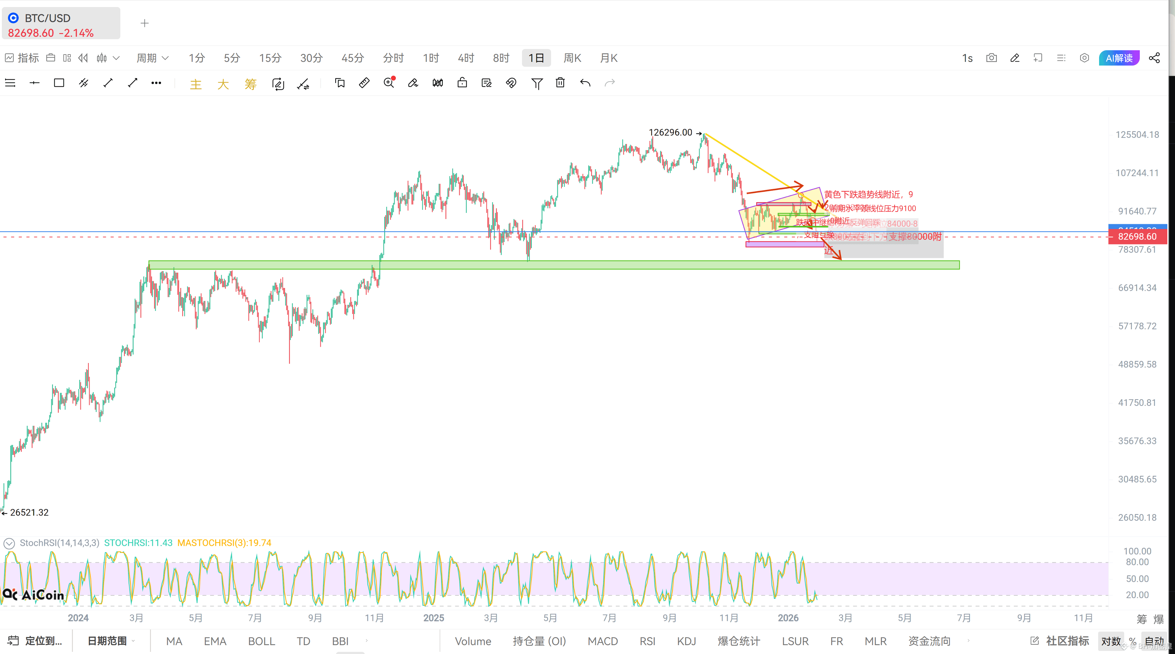 目前这个位置测试前低80000附近后可能有一个小反弹到84000-845000附近然后震荡再向下到我们的中期第二目标位70000附近。