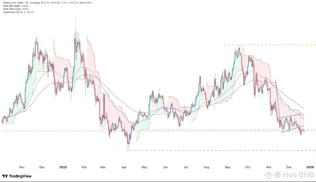 This places $SOL in a compression phase — either support holds and price rebounds, or the floor gives way and unlocks deeper downside.