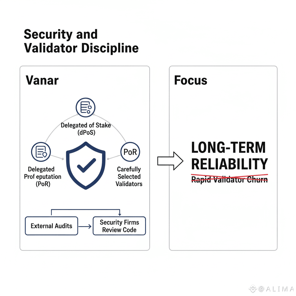 Validators are chosen based on reputation, not randomness. Protocol changes undergo external audits. Code follows industry best practices and is reviewed by established security firms.