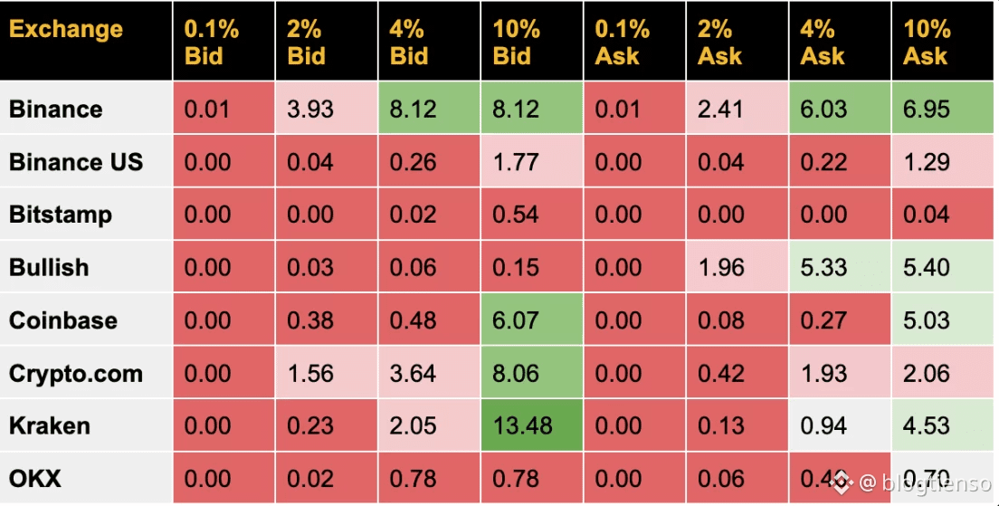 Dữ liệu từ độ sâu sổ lệnh của Kaiko (xem hình bên dưới) cho thấy "thanh khoản BTC gần như bằng không hoặc gần như ở mọi mức" trên hầu hết các sàn giao dịch lớn, ngoại trừ Binance, Crypto.com và Kraken. Sự sụt giảm này đồng nghĩa với việc mỗi lần bán bắt buộc đều đẩy giá lên cao hơn bình thường. Hơn nữa, việc quản lý rủi ro giao dịch chéo sàn và hoạt động kinh doanh chênh lệch giá cũng bị gián đoạn.” – Binance