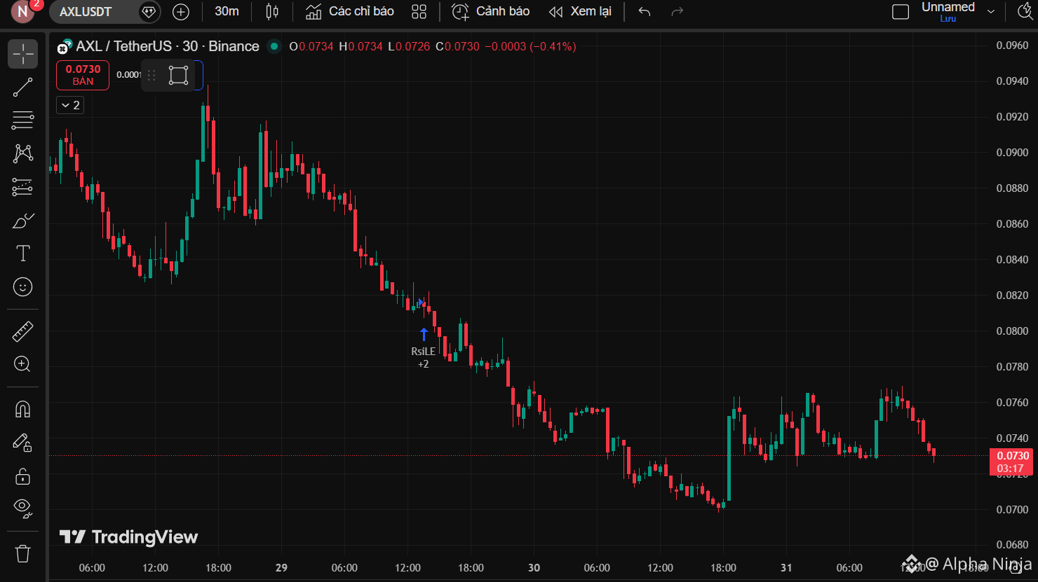 Điểm đáng để ý là sau cú rơi mạnh, AXL không tiếp tục gãy sâu. Giá đi ngang ở vùng thấp, biên độ hẹp dần, volume mỏng. Điều này cho thấy lực bán chủ động đã giảm đáng kể.