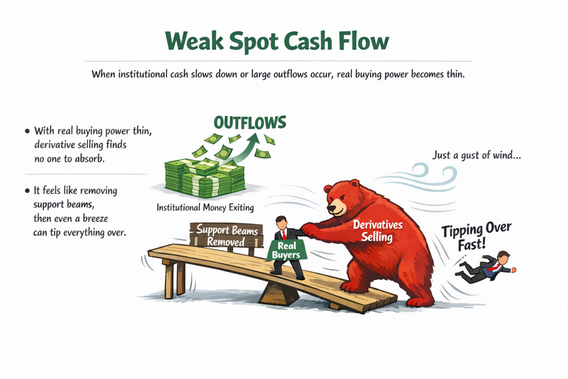 Khi lực mua thật mỏng, nhịp bán từ phái sinh không gặp người đứng ra hấp thụ.
