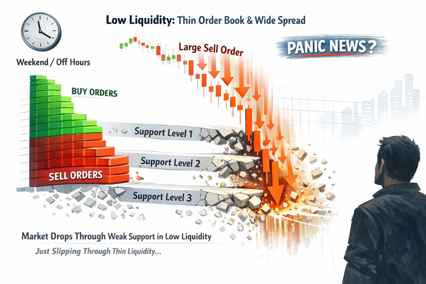 Khi thị trường rơi vào khung giờ thanh khoản mỏng, nhất là cuối tuần, sổ lệnh thường nông hơn, spread giãn ra và lực mua đỡ yếu đi.