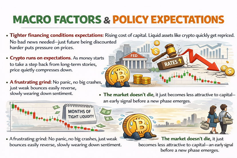 Khi kỳ vọng về điều kiện tài chính trở nên chặt chẽ hơn, chi phí vốn tăng lên, các tài sản nhạy với thanh khoản như crypto sẽ bị định giá lại rất nhanh. Không cần tin xấu rõ ràng, chỉ cần tương lai bị chiết khấu mạnh hơn là giá đã chịu áp lực.