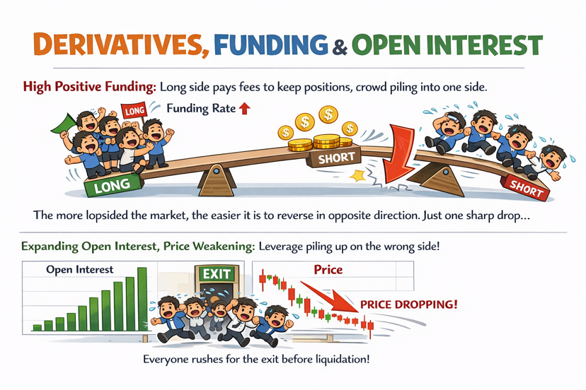 Nếu open interest phình ra trong lúc giá bắt đầu yếu, thường là dấu hiệu đòn bẩy đang chất sai phía, và khi bị phá thì tốc độ rơi sẽ nhanh hơn tưởng tượng, vì ai cũng muốn thoát trước người khác.