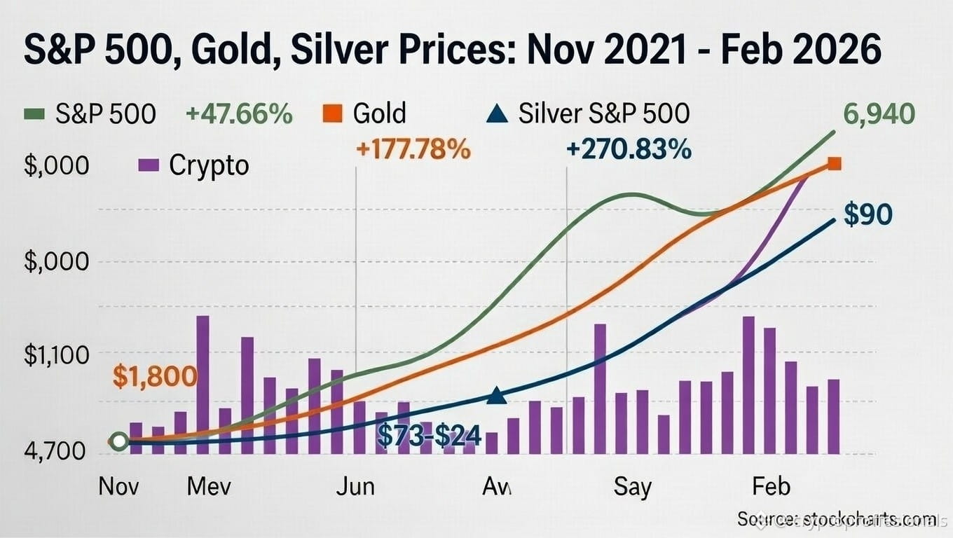 Gold: Traded around $1,800–1,850/oz in late 2021. Now? Spot prices are in the $4,800–5,500/oz range (recent highs touched even higher before pullbacks), representing a massive ~160–200%+ increase. Central bank buying, inflation hedging, and geopolitical uncertainty have fueled the bull run.