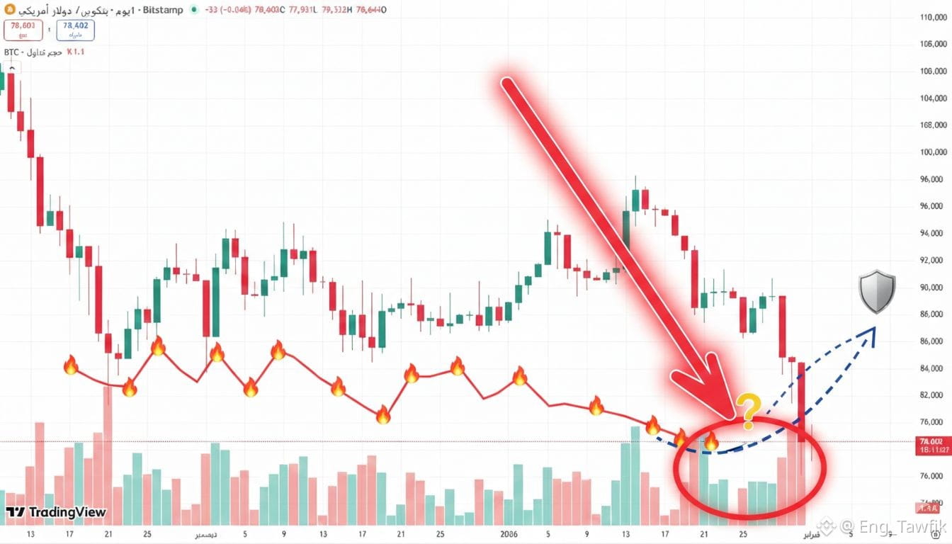 الفجوة السعرية: السعر حالياً يترنح عند 78,602 🛑. هذا الهبوط السريع كسر "القيعان" السابقة التي تشكلت بصعوبة في شهري ديسمبر ويناير، مما يعني أن الاتجاه قصير المدى تحول من "صاعد/عرضي" إلى سلبي جداً، وأصبح الهبوط هو سيد الموقف 😰.