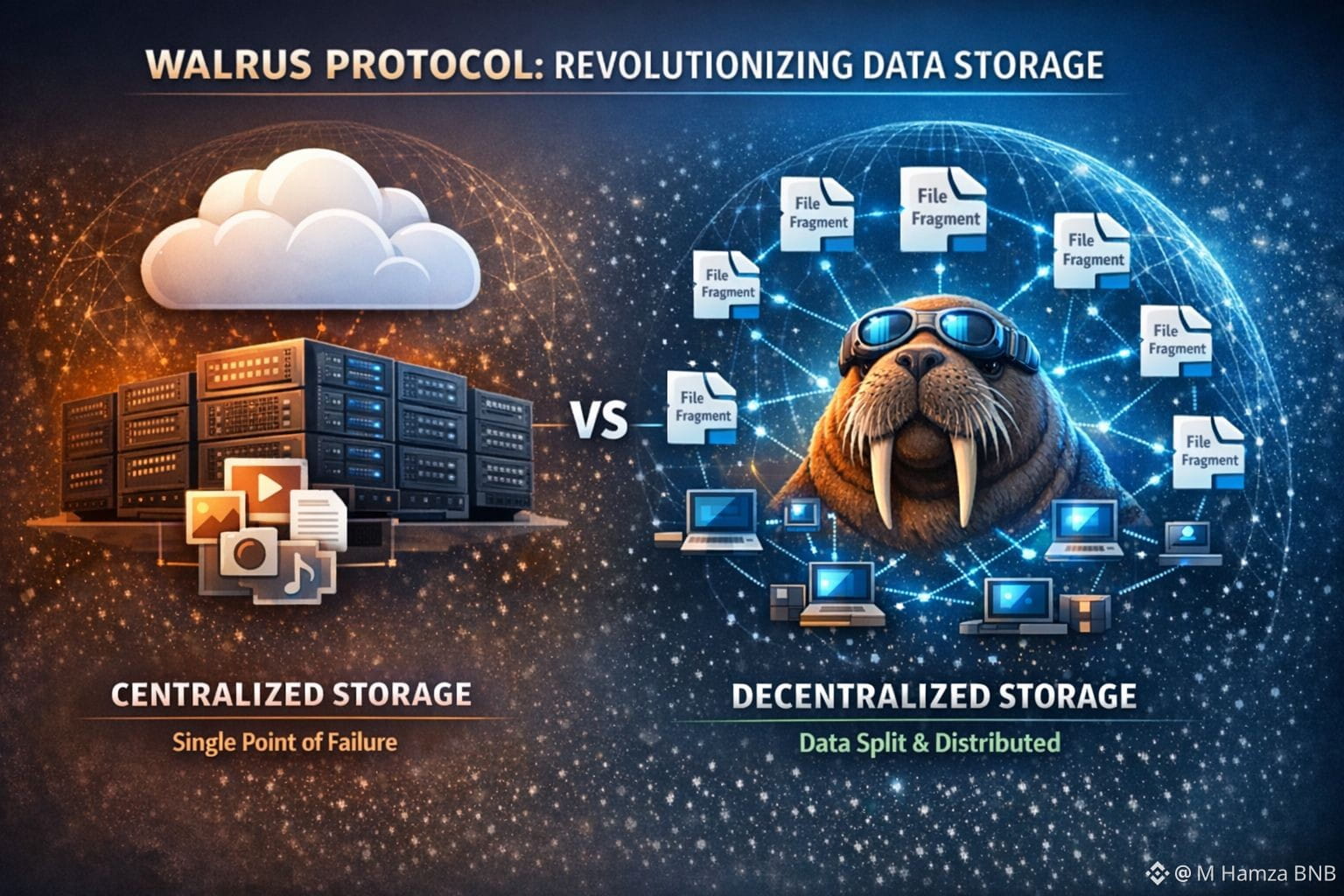 When I first started digging into the Walrus Protocol it felt like discovering something that could really change how we think about storing our information online. This idea goes far beyond the familiar cloud services we all use every day. Instead of trusting a big company to hold your videos, images, or documents on a server somewhere, Walrus breaks those big files into pieces and spreads them across a network of independent computers that all work together to keep your data safe and reliable. In a world where so much of what we do is digital, and people are starting to ask hard questions about who controls that data and how safe it actually is, Walrus came along with a different promise. It’s made to be decentralized so that no single point of failure can compromise millions of files. You’ve probably thought about how frustrating it is when a service goes down or loses data; Walrus aims to eliminate that worry by using lots of different nodes to share responsibility for every piece of information. It feels like the internet is finally moving toward a place where people can truly own what they put online and not be at the mercy of one giant server farm with no accountability behind it. This fresh way of handling data matters because our files are growing bigger every day and the old systems just weren’t built to handle that in a secure, cost-friendly way.