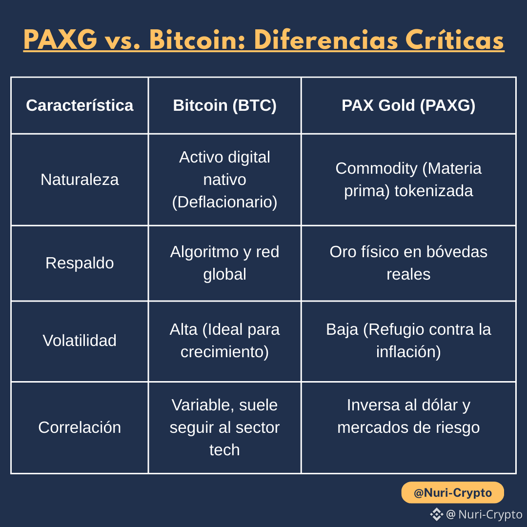 Lo primero que debemos entender es que PAXG no es Bitcoin, aunque ambos compartan la tecnología blockchain. Mientras que BTC es "oro digital" por su escasez programada y descentralización, PAXG es oro físico digitalizado. Si compras 1 PAXG, posees legalmente una onza troy de oro real.