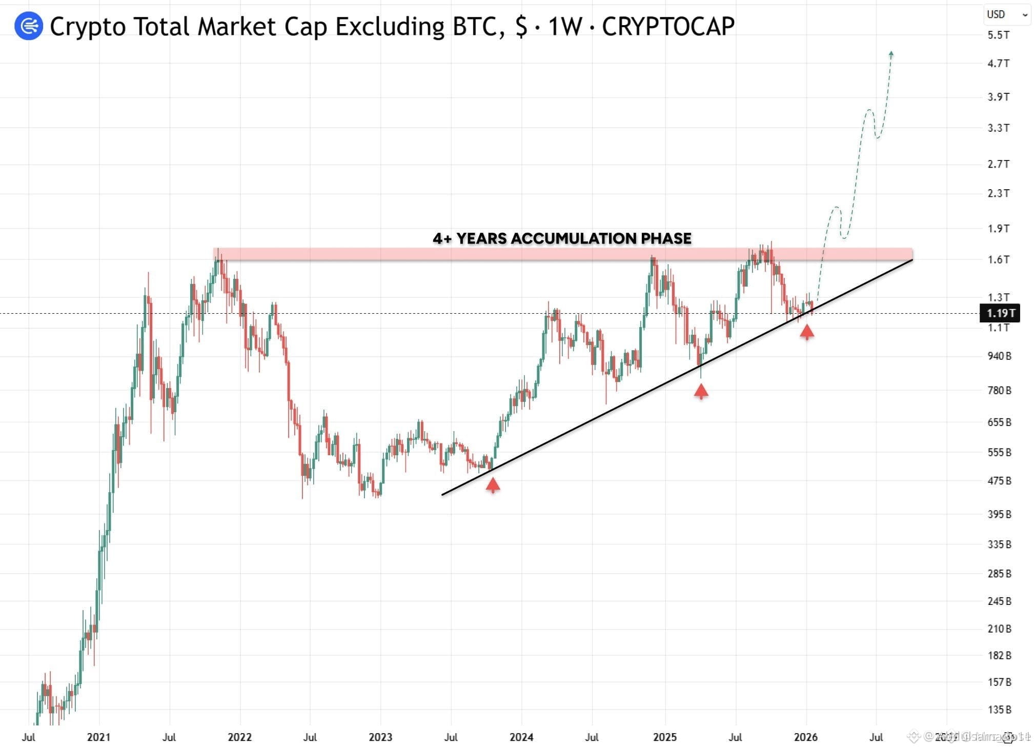 The total crypto market cap excluding Bitcoin is compressing right below a multi-year resistance — the same level that has capped price for over 4 years.
