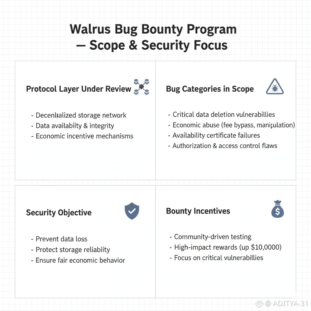 Walrus, jo ek decentralized data storage layer hai built on the Sui blockchain, ab security aur robustness ko next level pe le jaane ke liye bug bounty program launch kar raha hai. Ye program sirf “formal announcement” nahi hai — iska maksad network ke core components aur incentive mechanisms ko strong banana hai taki real use-cases me storage reliable aur safe rahe.