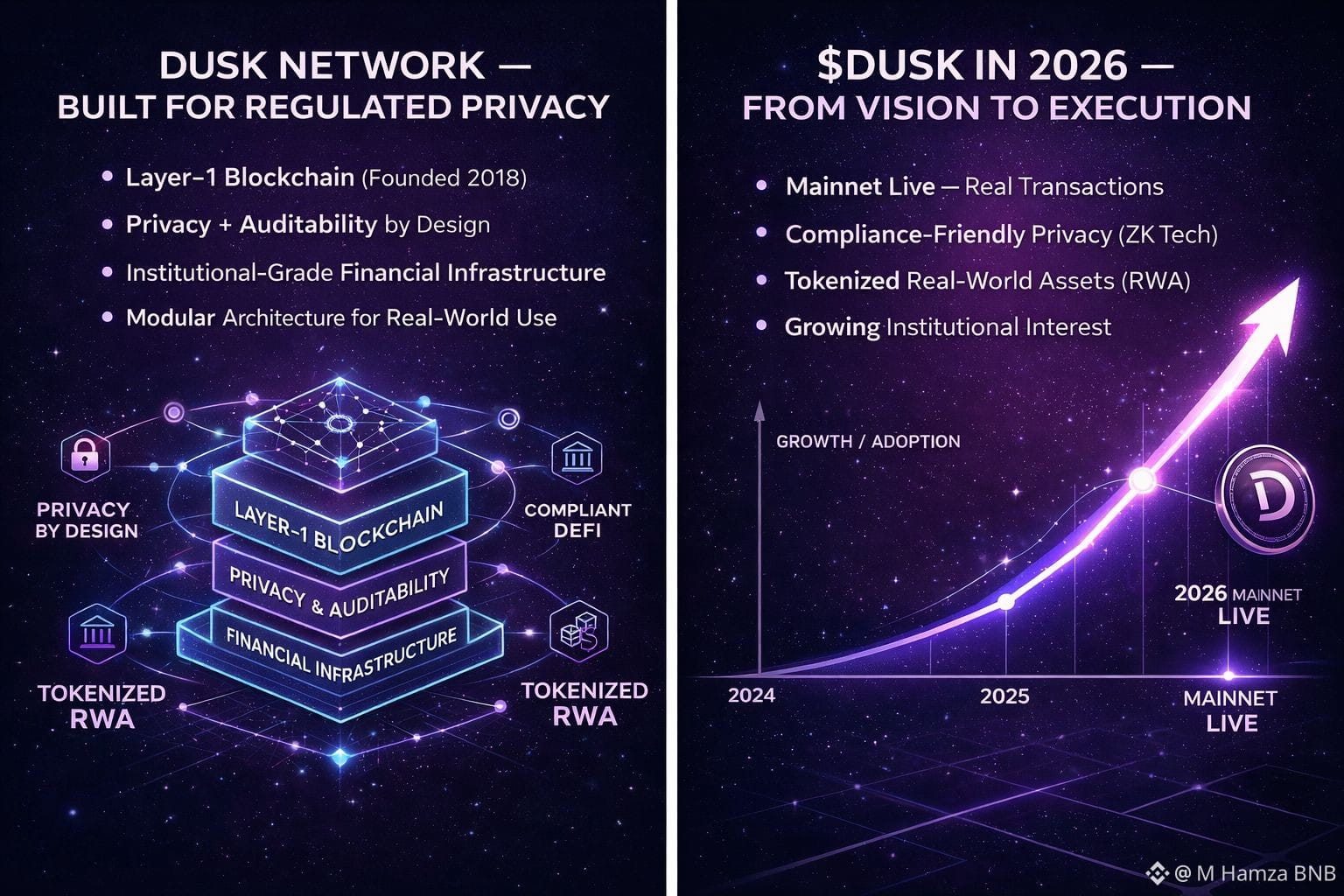 In early 2026, the DUSK ecosystem — built on the privacy-centric layer-1 blockchain Dusk Network — is quietly emerging as a rare blend of institutional appeal and crypto market traction. Founded in 2018 with the mission to power regulated, privacy-focused financial infrastructure, Dusk’s narrative has shifted from theoretical promise to live execution following a series of meaningful milestones and market moves.