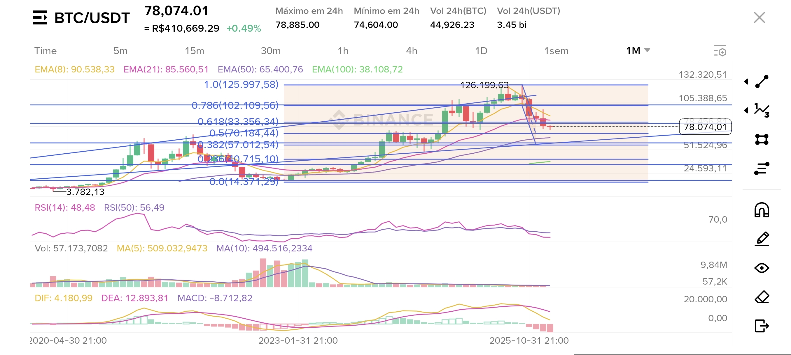 • A Marca de 38.2 (Queda de ~62% do Topo): O "Chão Chato" do Cripto: Agora, olha a loucura do BTC: o nível de 38.2 da Fibo (quando o preço já derreteu 62% do topo e só sobrou 38% do valor) é onde o mercado cripto costuma encontrar o seu suporte de ciclo.