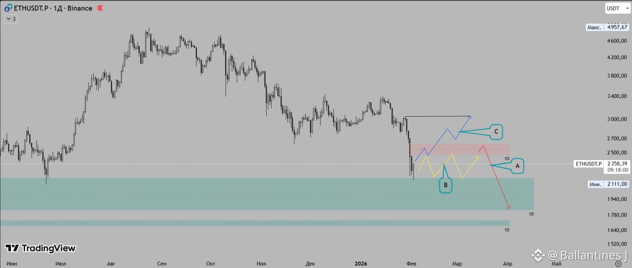 Краткосрочно ETH может показать попытку силы и вернуться в область 2500 для закрытия дисбаланса. Такой рост логично рассматривать как технический, с последующим откатом и риском повторного снижения в сторону зоны около $2000.