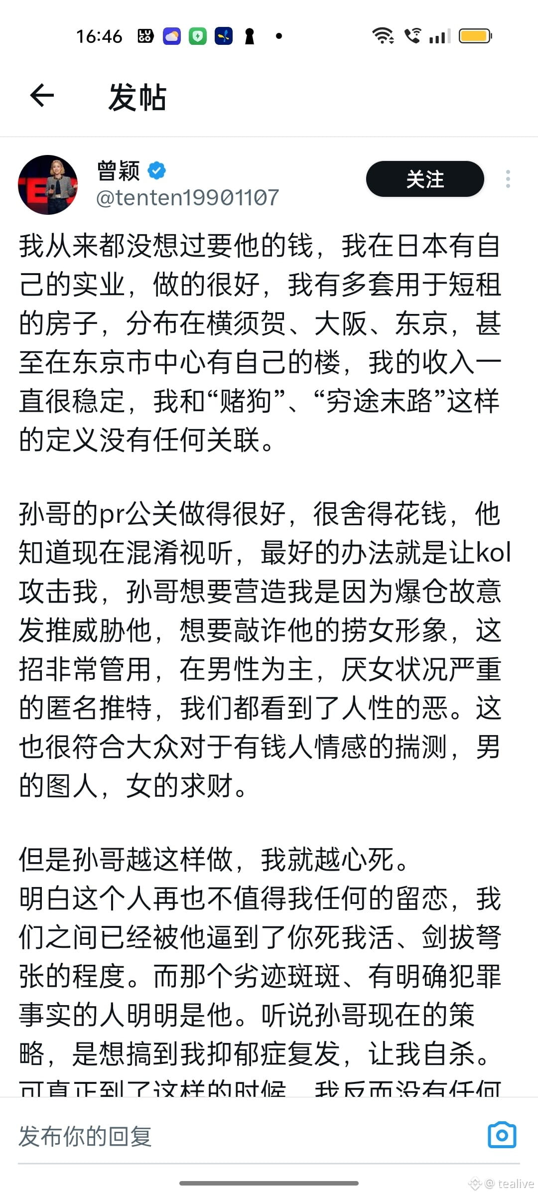 孙宇晨(Justin Sun)这两天再度霸屏。一位自称是其前女友的女子 Ten Ten(曾颖)突然在 X 开麦,直接点名:$TRX 创立初期,通过员工当“人头”,批量注册交易账户,集中拉盘 TRX,再高位分批出货,把散户当成流动性来源。
