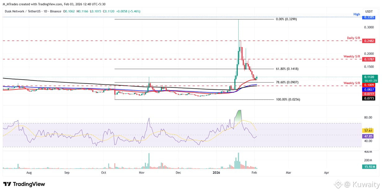 إذا استمر DUSK في تعافيه، فقد يمدد الارتفاع نحو مستوى تصحيح فيبوناتشي 61.8% (المُرسم من أدنى مستوى في أكتوبر عند 0.025 دولار إلى أعلى مستوى في يناير 2024 عند 0.329 دولار) عند 0.148 دولار.