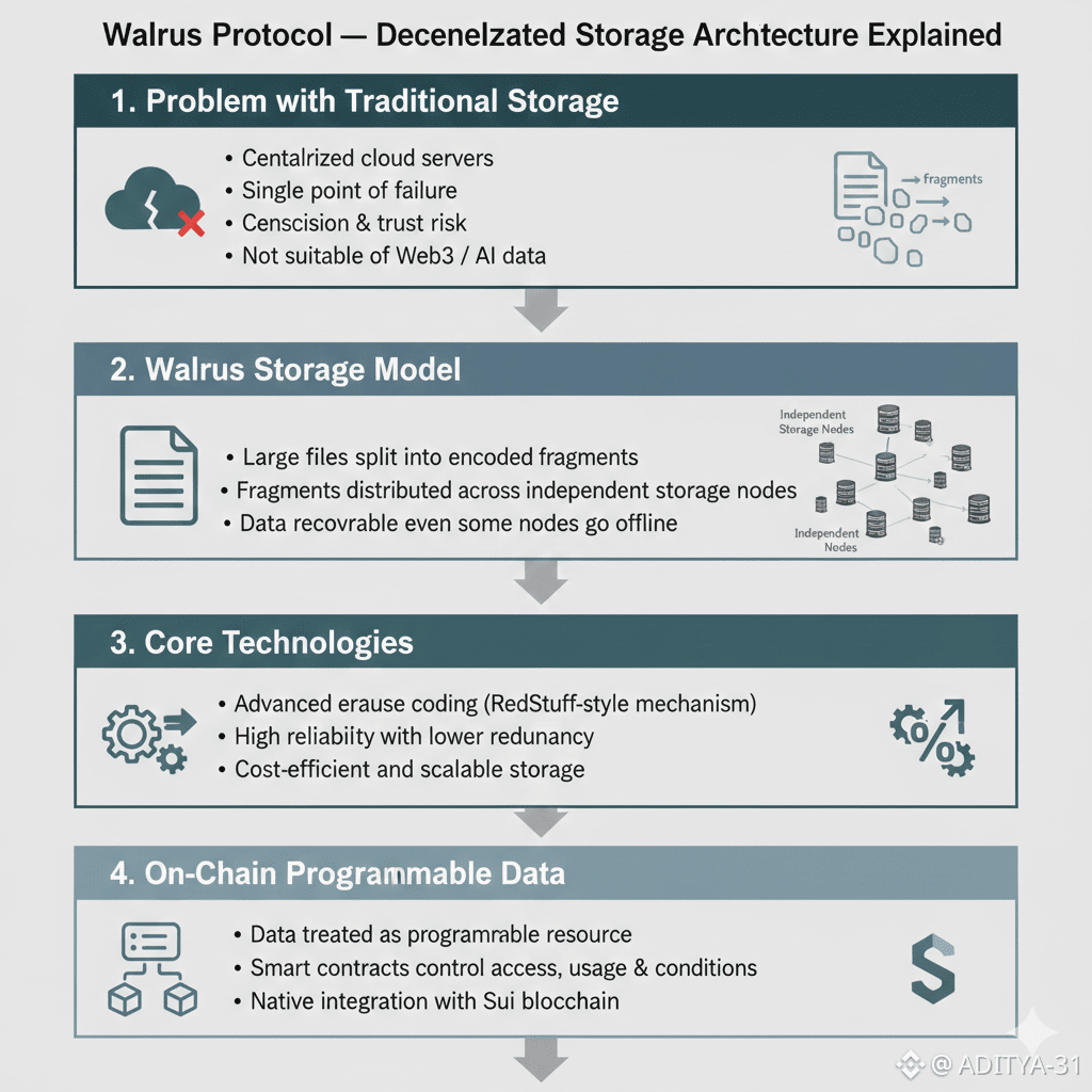 Walrus ka basic idea simple hai, lekin execution complex aur thoughtful hai. Data ko centralized servers me store karne ke bajaye, files ko multiple encoded fragments me tod diya jaata hai. Ye fragments independent storage nodes ke across distribute hote hain. Agar kuch nodes offline bhi ho jaate hain, tab bhi data reconstruct ho sakta hai. Is approach se reliability aur resilience dono improve hoti hain.