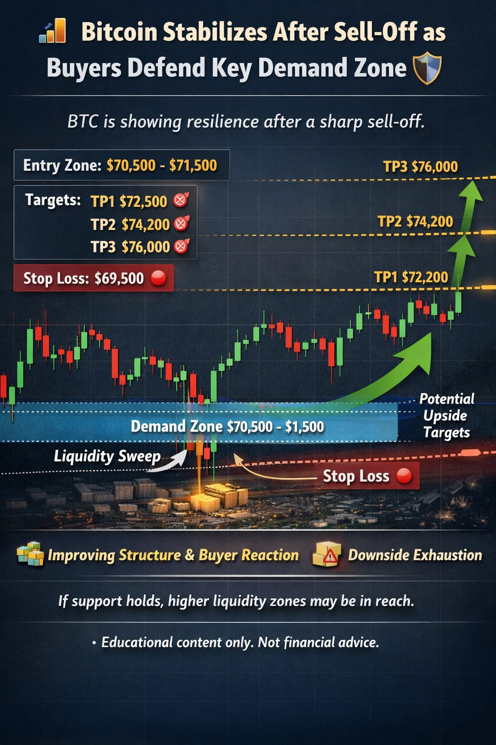 Bitcoin $BTC has shown signs of resilience after a recent aggressive sell-off ๐. Selling pressure appears to be easing as price begins to stabilize near a key demand zone, suggesting that buyers are gradually stepping back in ๐.