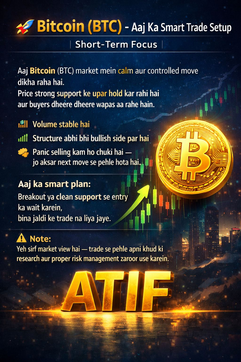 Aaj ka smart plan yeh hai ke breakout ya clean support se entry ka wait kiya jaye, bina jaldi ke trade na liya jaye.