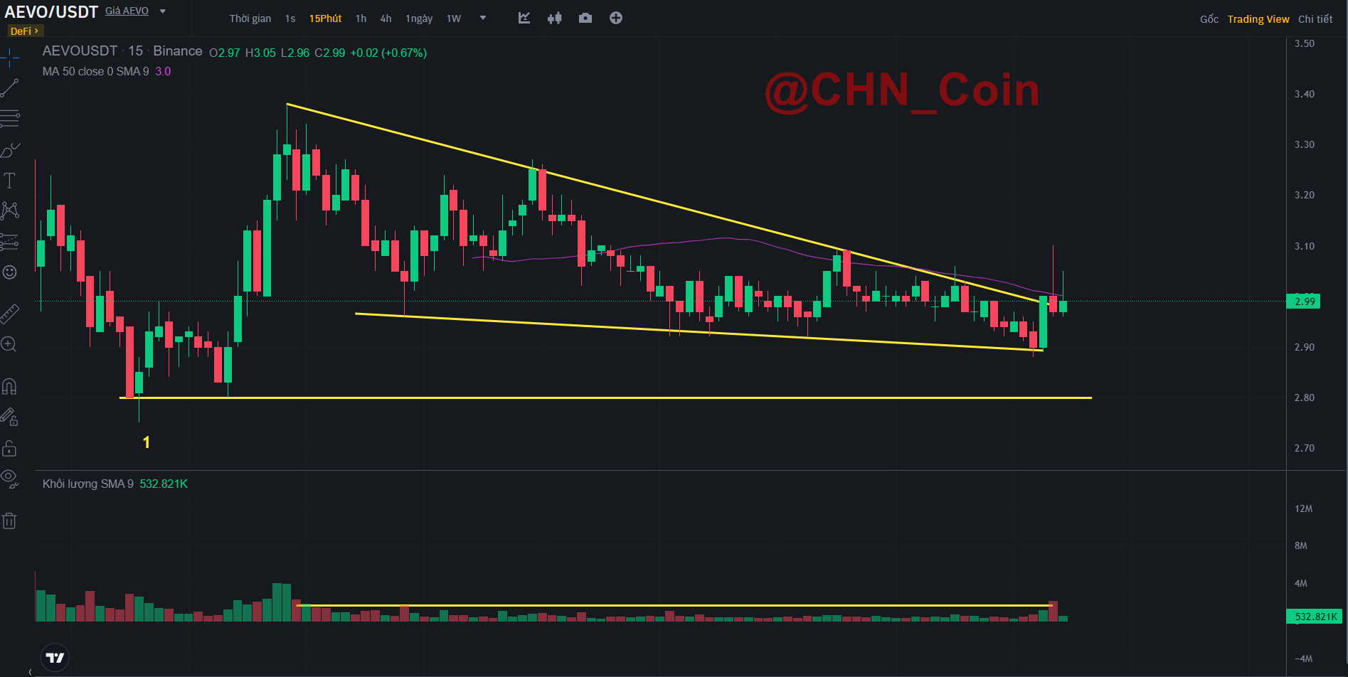 -> Chúng ta cần chờ 1 cây nến vượt lên SMA50 và có volume to hơn hẳn bọn phía trước để phân vốn vào mua. Cùng canh với mình nhé 😁