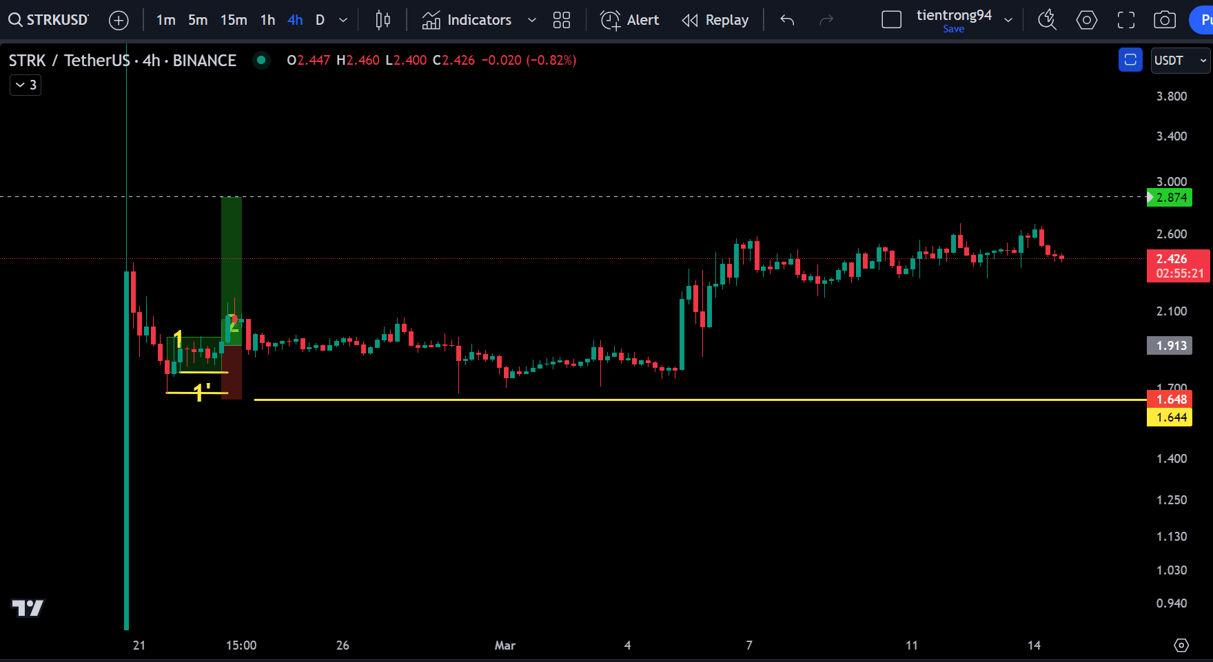 - Sau 1 ngày thì hiện tại ai bán đã bán rồi, giá bắt đầu đi trong hình cái nêm và không giảm qua đáy 1 (mình đánh dấu trong hình)