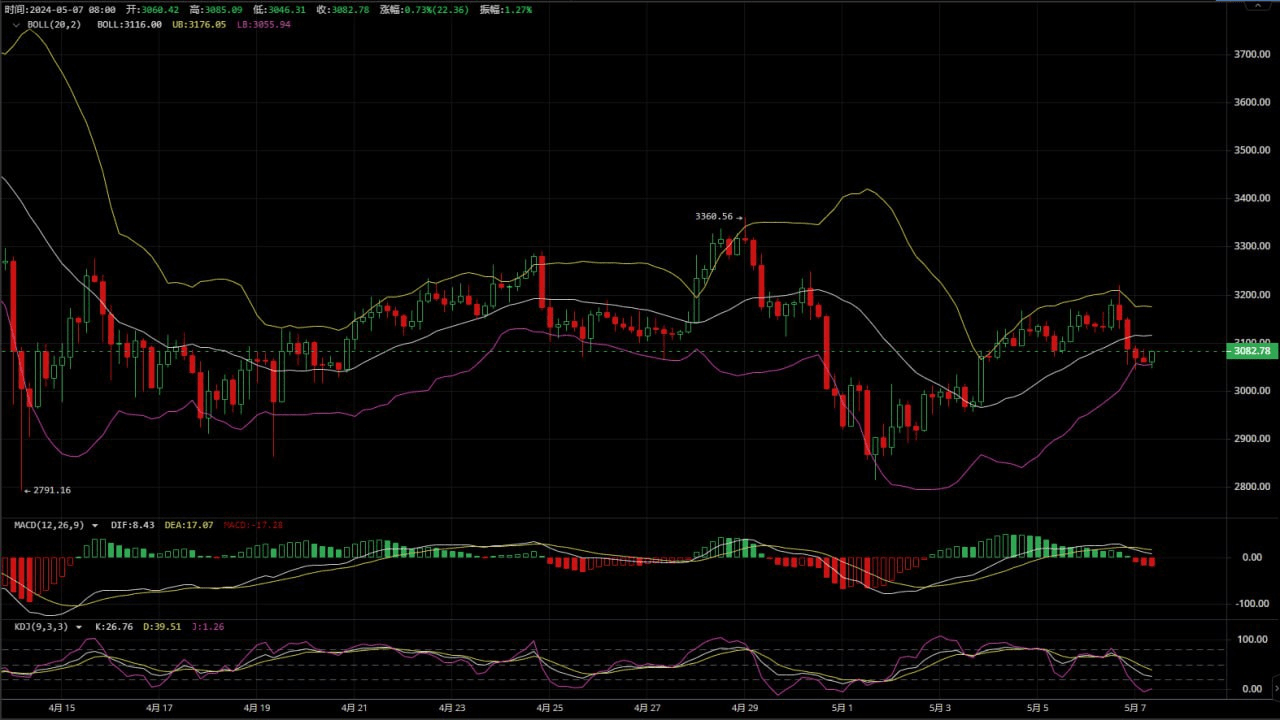 以太坊日内价格在3050一线震荡吸筹,目前日线上以太坊下方并没有明显支撑位置可以参考,高位压制建议关注3160-3180区间, 个人观点是若比特币没有支撑于62000走出上行,那么以太坊就很难企稳3000上方继续吸筹,所以以太坊日内反弹做空依旧是主流,虽然目前来见现价抄底可能会有一定的利润空间,但若价格持续走跌那么风险就会放大,不符合做单逻辑。短线四小时上价格维持在下跌通道中,低位支撑关注3020,上涨阻力关注3120一线的顶底转换。一小时上boll三线开口运行,价格整体有轻微底背离迹象,后续价格会在3040支撑后走出一定的上涨空间。综合上述以太坊后续稳健反弹做空处理。#btc走勢 #eth二饼