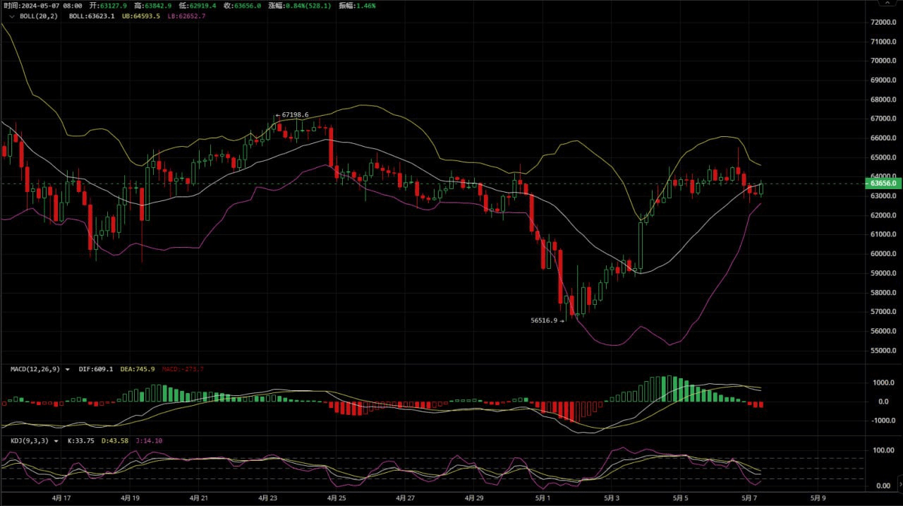 在昨日下午四点价格最高冲击65500承压走出下跌,最低跌至62650附近,今天日线上高位压制关注64200一线,下方支撑关注62000附近,整体上日线趋于一个下跌之后的震荡修复。短线四小时上boll三线开始收缩,价格整体维持在震荡偏向下跌的行情中,四小时上行阻力关注63600-63800区间,下方支撑关注62100附近,附图指标上macd多空能量转换,快慢线死叉向下发散,四小时整体后市建议关注上涨受阻之后继续下跌寻找支撑的走势。一小时上价格已经维持在下跌通道之中,整个下跌区间关注63800-61800。综合上述建议比特币稳健日内继续反弹做空。