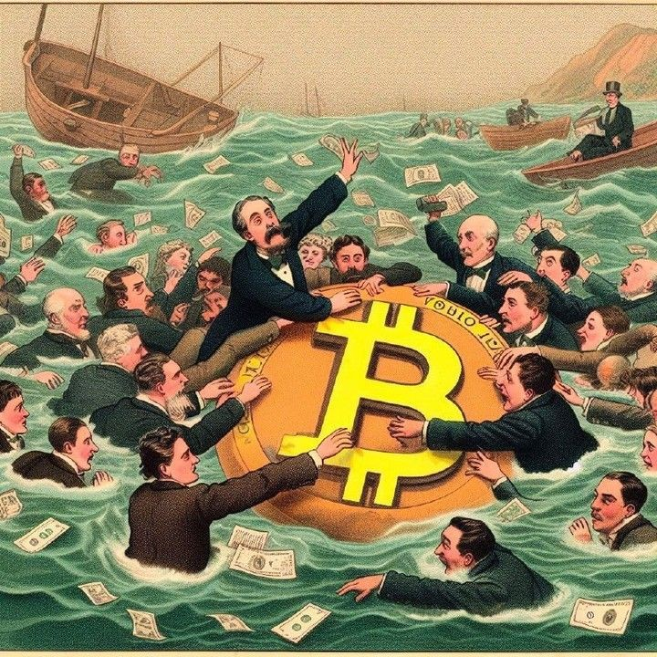 An stock image of men trying to clinge to bitcoin as rescue once overboard in the sea, a metaphor of crisis.
