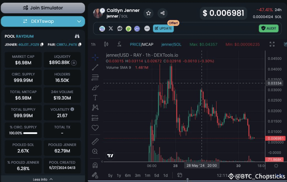 凯瑟琳·詹纳发行的代币JENNER第一天便引起了广泛关注。然而,尽管詹纳勤奋工作,不断在Space直播中与粉丝互动,并通过X平台频繁发布和转发消息,币价仍持续下跌。当前市值约750万美元,24小时内跌幅超过50%。