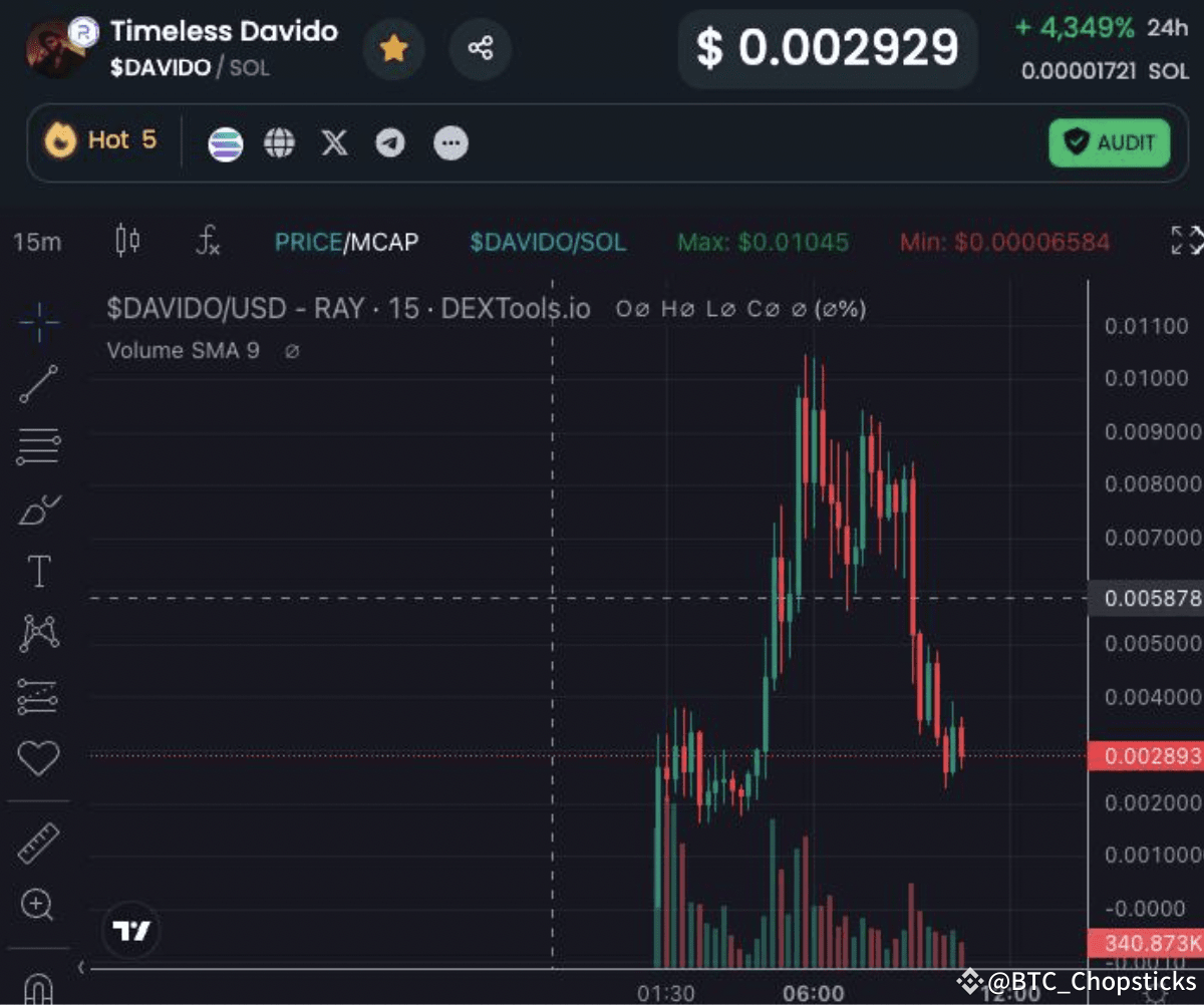 結果呢?開盤爆拉,從0.000065到0.01,然後暴跌,目前在0.003。當前市值300萬美元左右。價格完美走出了一棵聖誕樹。