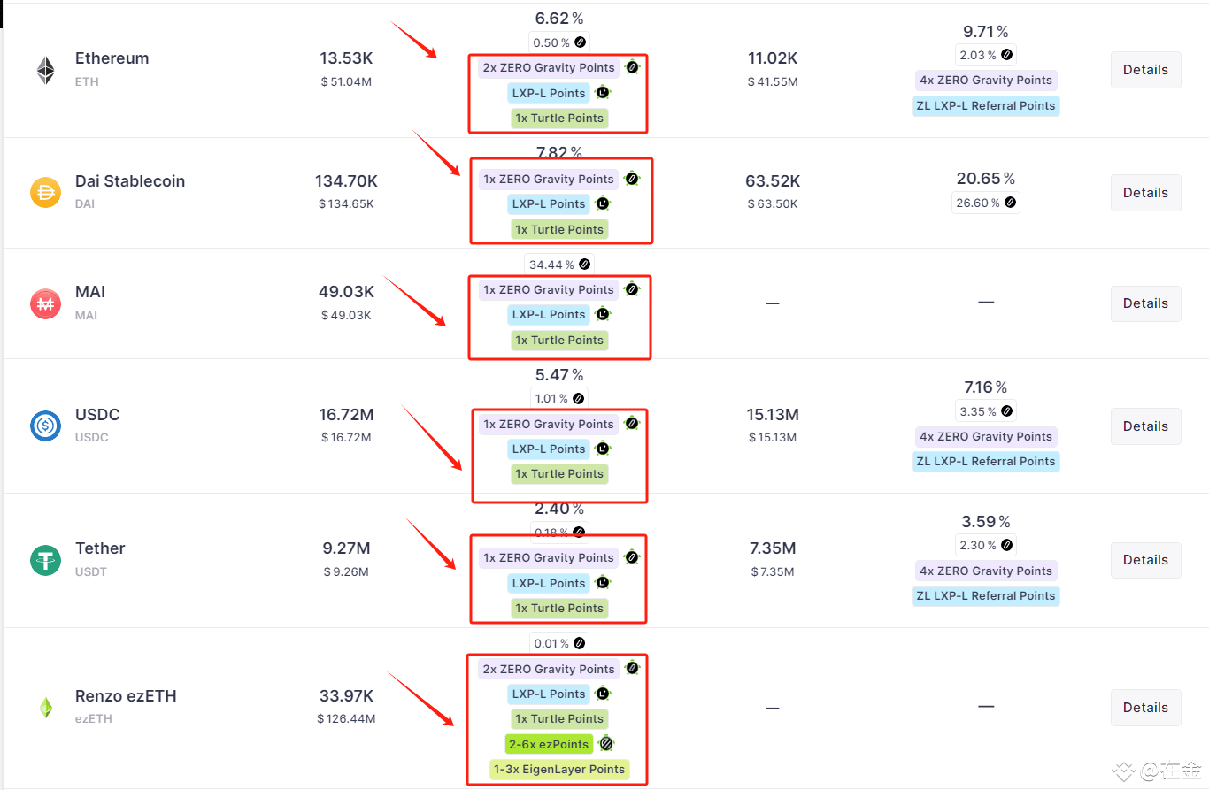 我们其实在质押的界面可以看到,存入各类币种我们可以获得的积分