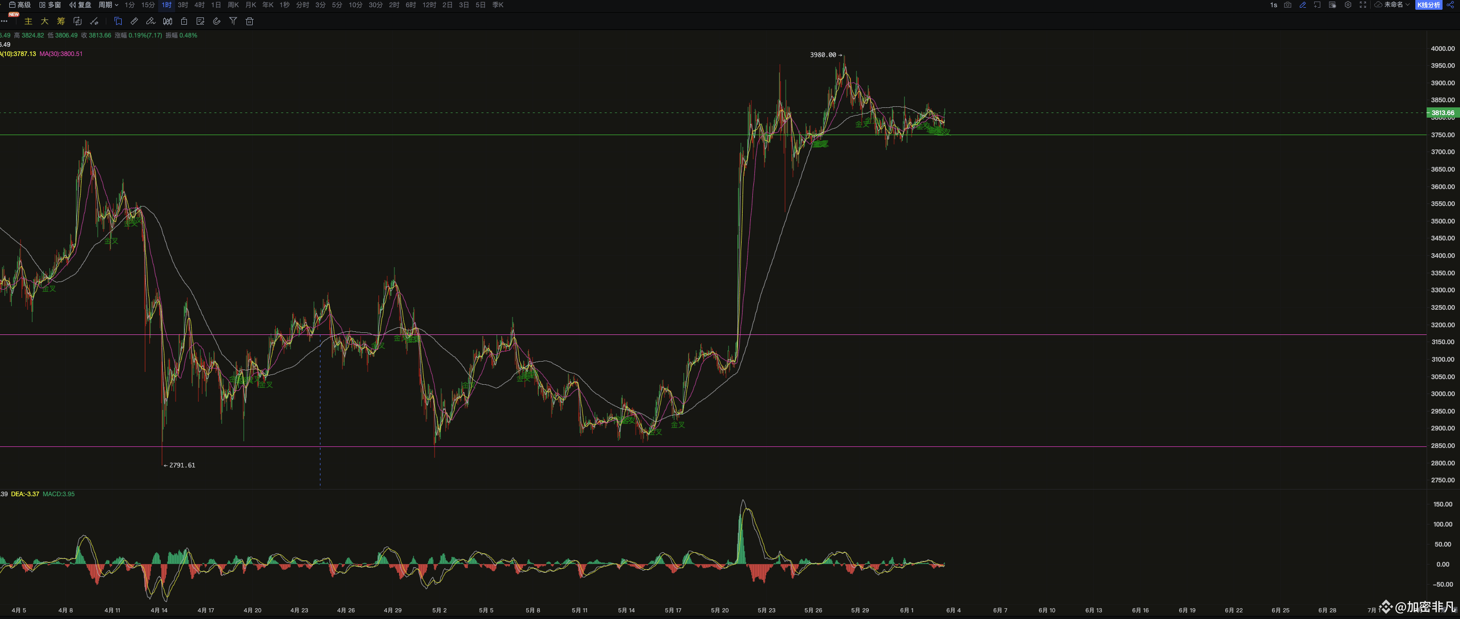 以太坊在上周周线收阴,当前3650美元已经成为明显的支撑位置,而日线上3800美元形成新的压制。附图指标MACD上快慢线死叉运行,多空量能发生明显转变,日线重点关注3800美元的压制力度。以下是具体的行情解析和操作建议: