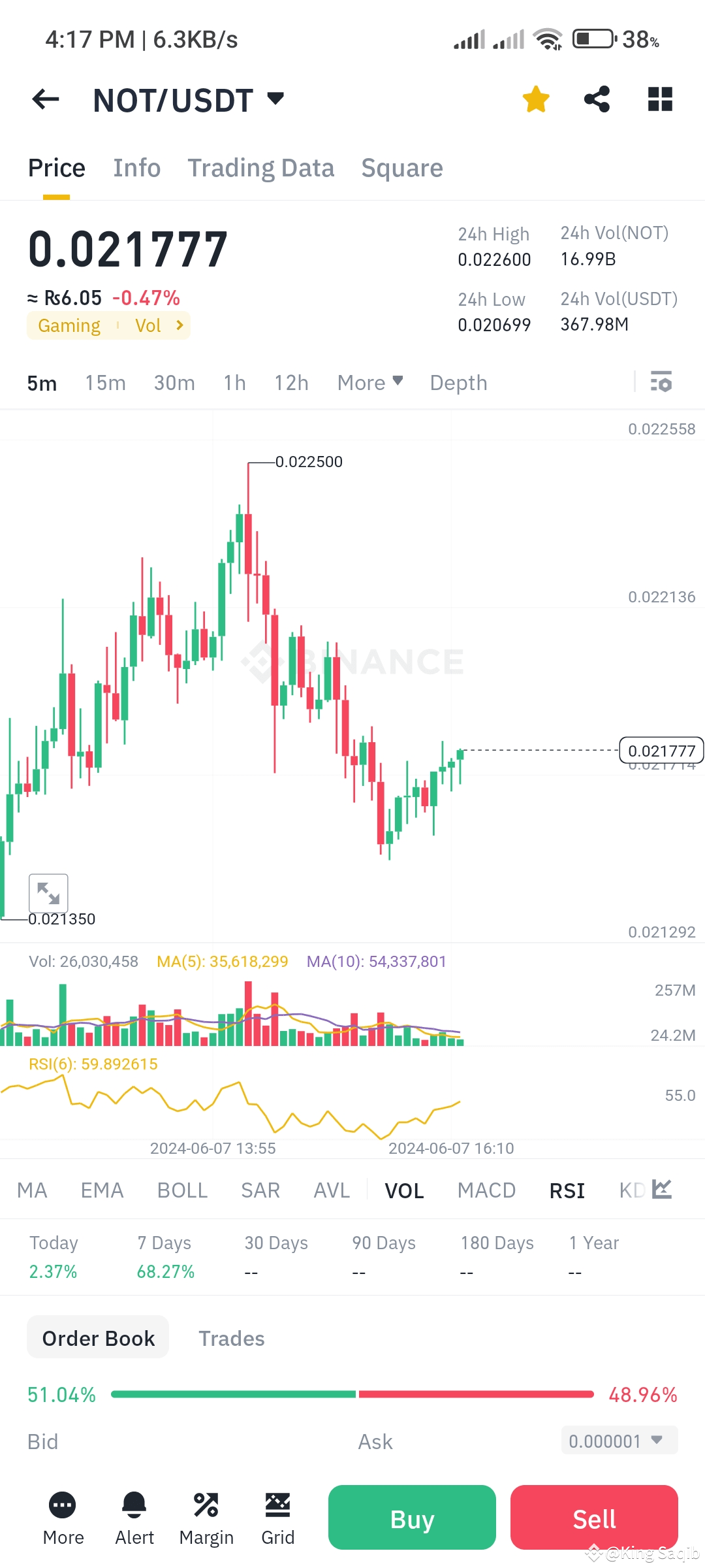 - High trading volumes for both NOT and USDT suggest high liquidity and potential interest from traders.