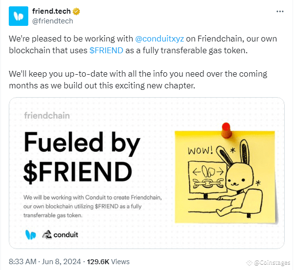 Friend.tech, a key player in web3 social networking, has announced its partnership with Conduit to develop Friendchain, a new native blockchain. This blockchain initiative aims to utilize the FRIEND token as a transferable gas token within its ecosystem.