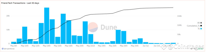 Since its launch in August 2023, Friend.tech has been a prominent SocialFI decentralized application (dApp) on the Base network. At its peak, the platform processed a daily transaction volume exceeding 500,000, but recent data from a Dune Analytics dashboard indicates a significant decline to fewer than 1,000 transactions per day.