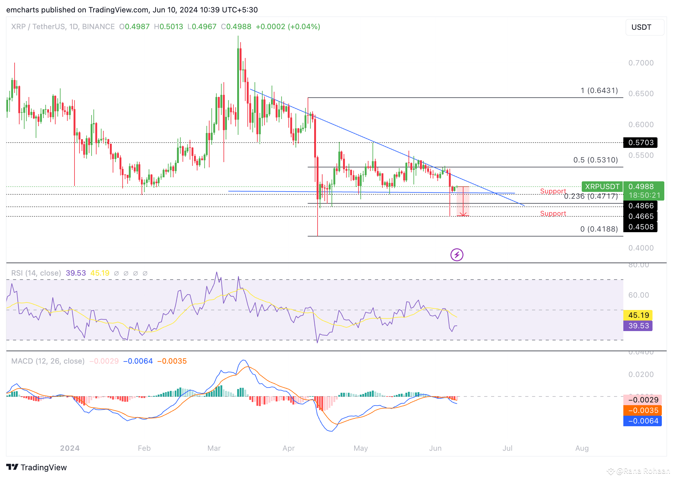 The bearish chart pattern is characterized by a descending upper trendline and a second, flatter horizontal trendline. XRP price touched the upper trendline on several occasions between May 25 and June 6 and the lower trendline at $0.4917 has acted as support between March 25 and June 10.