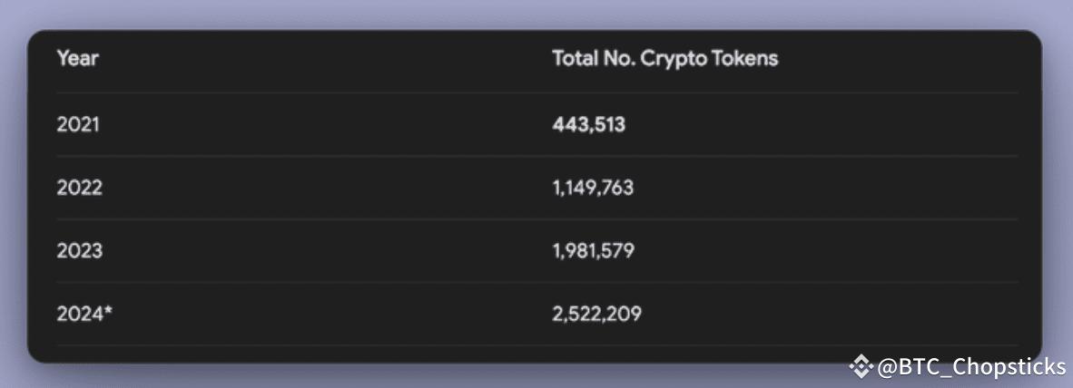 结果,2024年见证了历史上最多的新代币推出,比2021年牛市高峰期多了近六倍的加密货币代币。